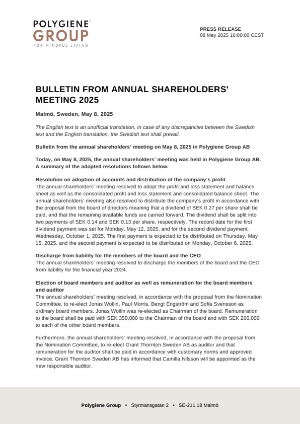 Bulletin from the annual shareholders’ meeting on May 8, 2025 in Polygiene Group AB
