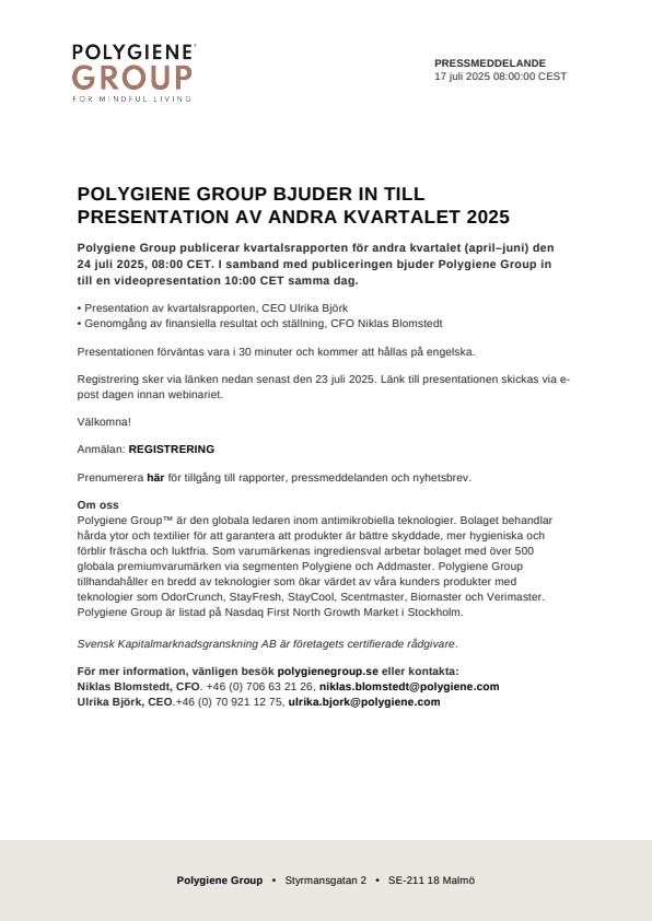Polygiene Group publicerar kvartalsrapporten för andra kvartalet (april–juni) den 24 juli 2025, 08:00 CET. I samband med publiceringen bjuder Polygiene Group in till en videopresentation 10:00 CET samma dag.