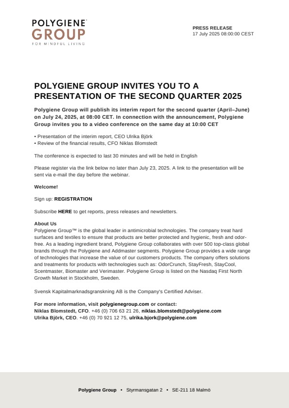 Polygiene Group will publish its interim report for the second quarter (April–June) on July 24, 2025, at 08:00 CET. In connection with the announcement, Polygiene Group invites you to a video conference on the same day at 10:00 CET